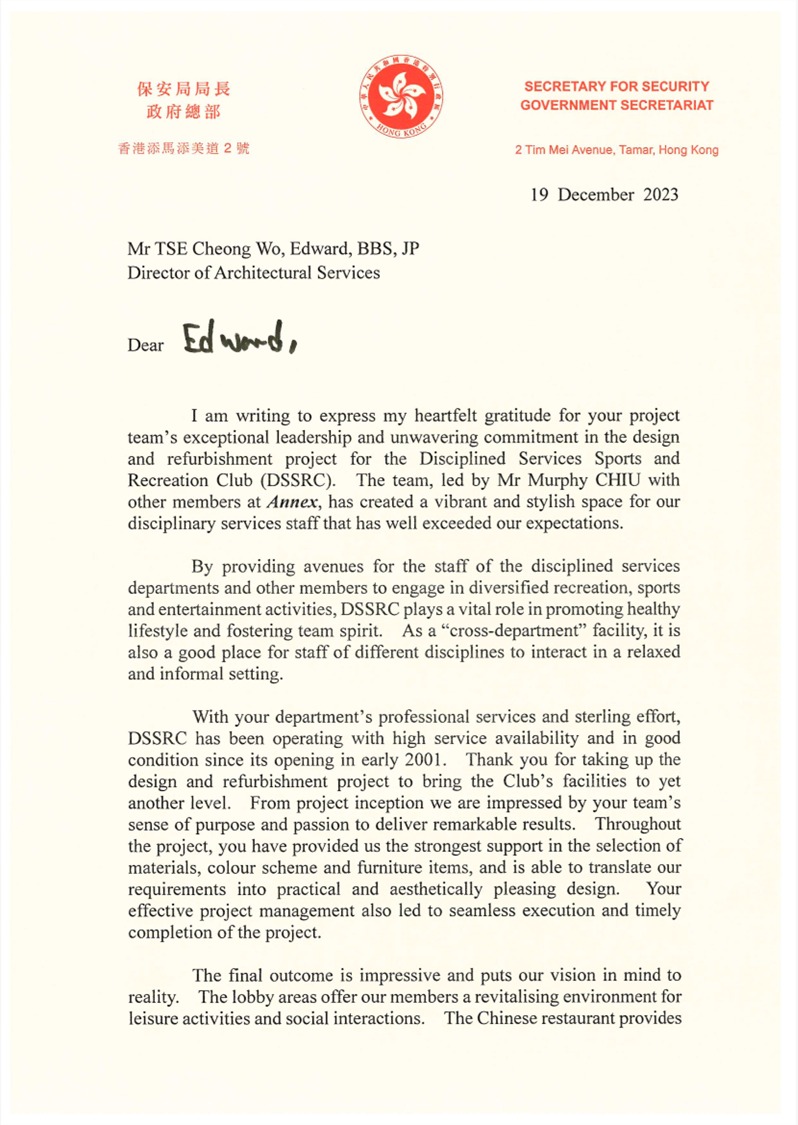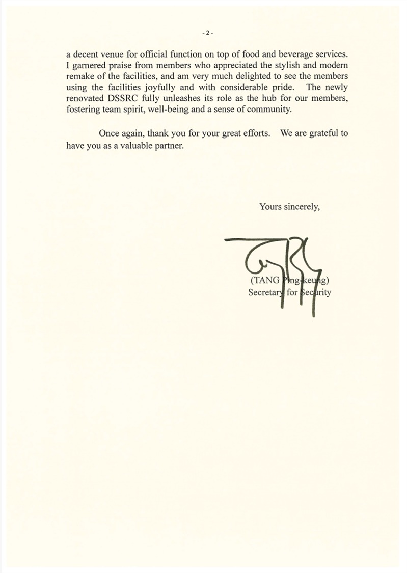 TC J921 contract was involved in the renovation project of 2/F Chinese restaurant for THE DISCIPLINED SERVICES SPORTS AND RECREATION CLUB under the Security Bureau. The process was filled with challenges, but ultimately, thanks to the efforts of the team and various subcontractors, it was completed by the designated date and received commendation from the relevant department.